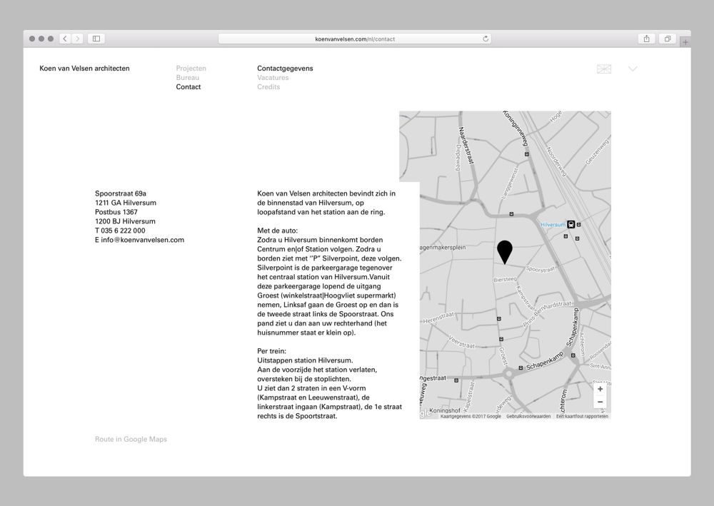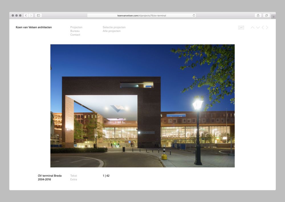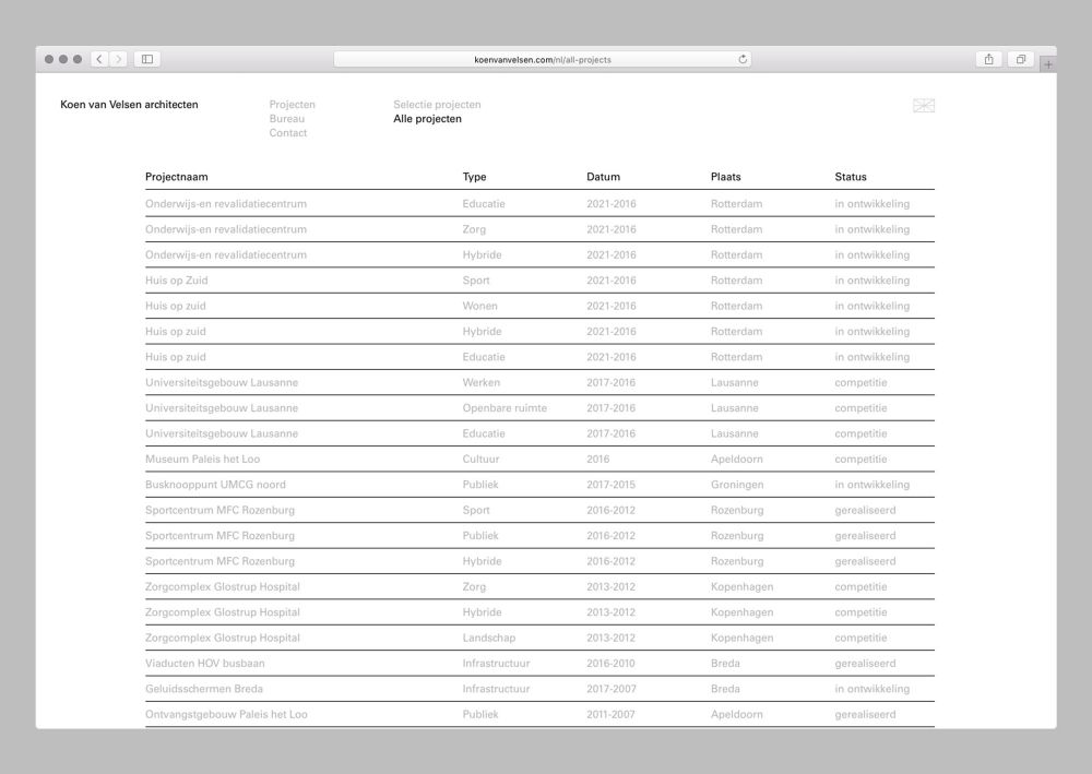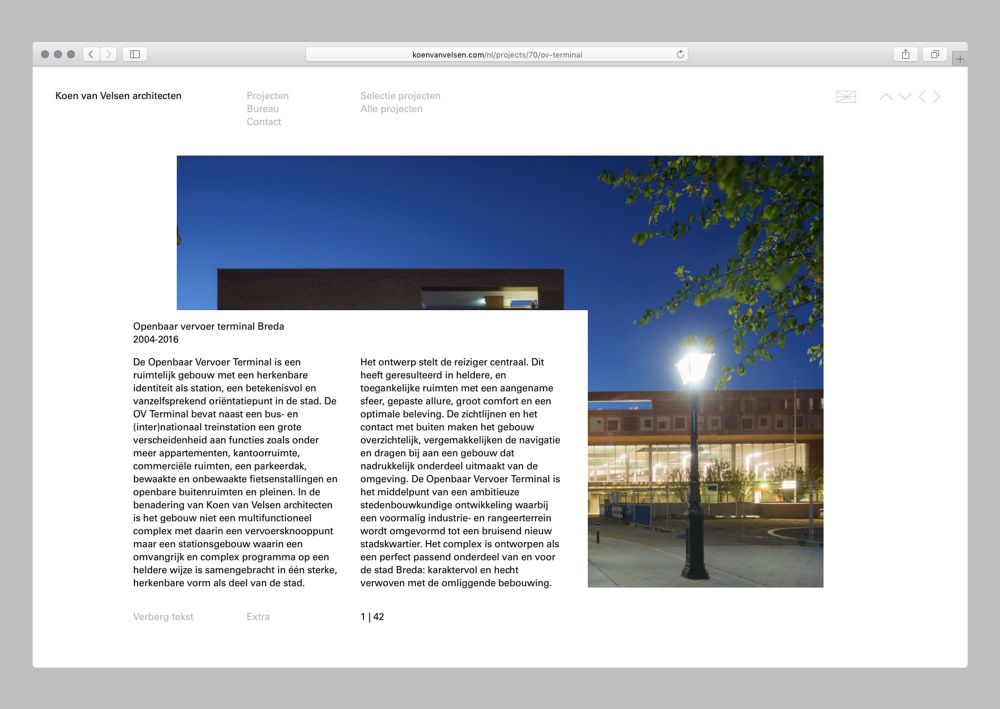 Voor de website van Koen van Velsen architecten heb ik het ontwerp van Reynoud Homan doorvertaald naar een geschikt responsive design. Daarnaast ontwikkelde ik de front end en het content management system.